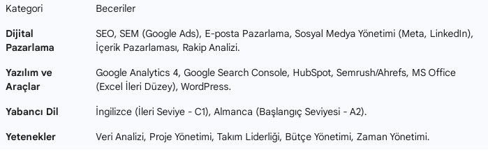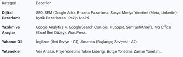 Yetenekler: Takım çalışması, problem çözme, iletişim (bunları deneyim kısmında örneklerseniz daha etkili olur).