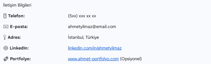 Önerilen: LinkedIn Profil Bağlantısı (URL'si), Kişisel Portfolyo/Web Sitesi Bağlantısı (varsa).